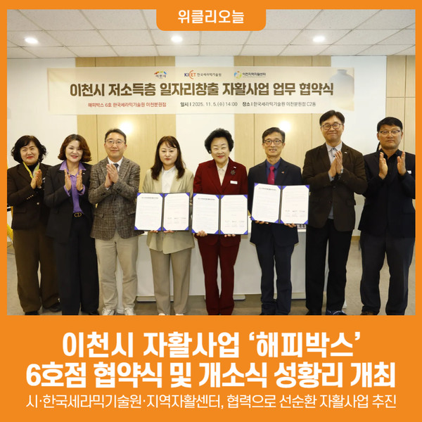 [경기 위클리오늘=박종국 기자] 이천시는 11월 5일 오후 2시, 한국세라믹기술원 이천분원에서 이천시 자활사업인 ‘해피박스 6호점’ 설치를 위해 이천지역자활센터, 한국세라믹기술원과 함께 3자 업무협약(MOU)을 체결하고 개소식을 성황리에 개최했다.